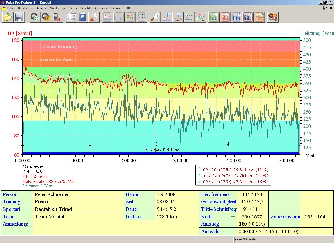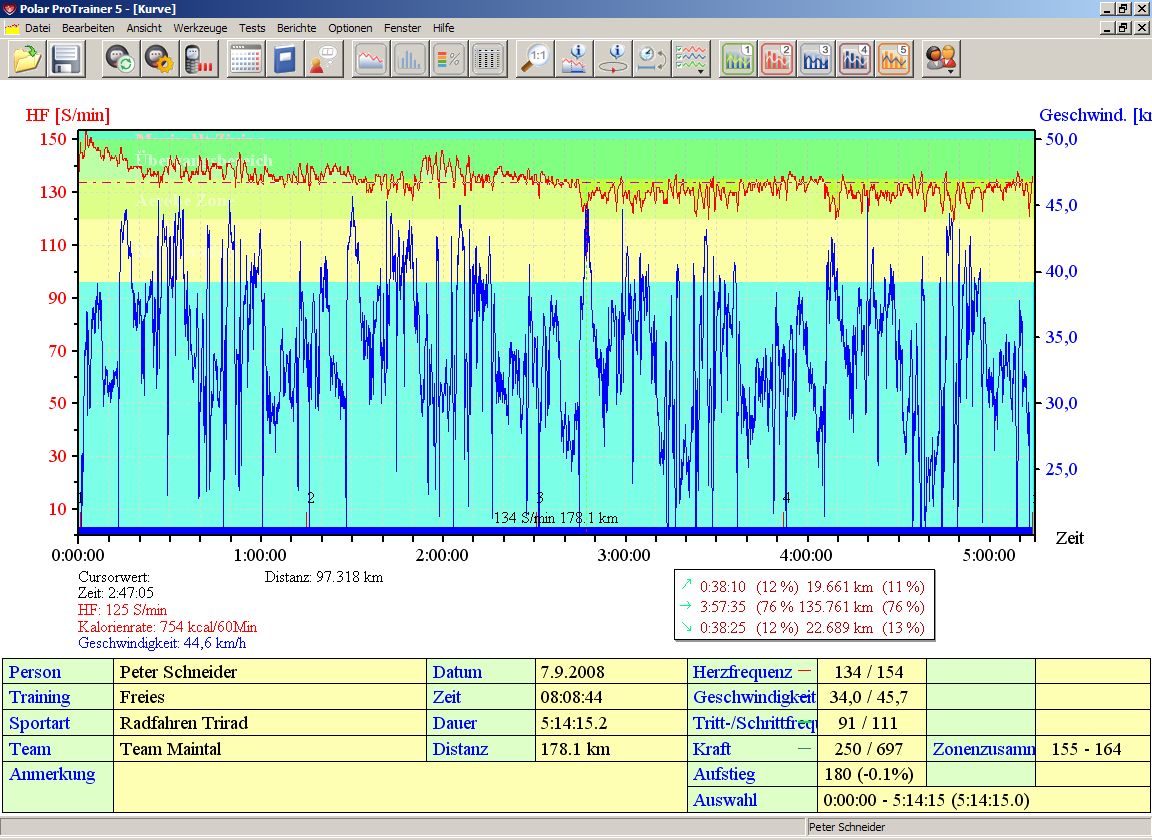bzw. die VerteilungskurveDie letzten 8km mit Wind von vorn hab ich dann nochmal richtig gelitten und bin dank mangelhafter Versorgung auch richtig eingegangen, dennoch mit 3:26h, wie erwartet, nur 10-15sec/km langsamer als in Almere gewesen. Im Endeffekt ist halt alles nur eine Willenssache, auf dem Rad war ich mit bereinigten 237 Watt sogar noch etwas stärker. Zum Glück empfing mich Diana, die nachmittags mit dem Zug angereist war, im Ziel, somit mußte ich nicht auch noch selbst mit dem Auto heimfahren, wäre vielleicht doch eine Belastung zuviel gewesen.