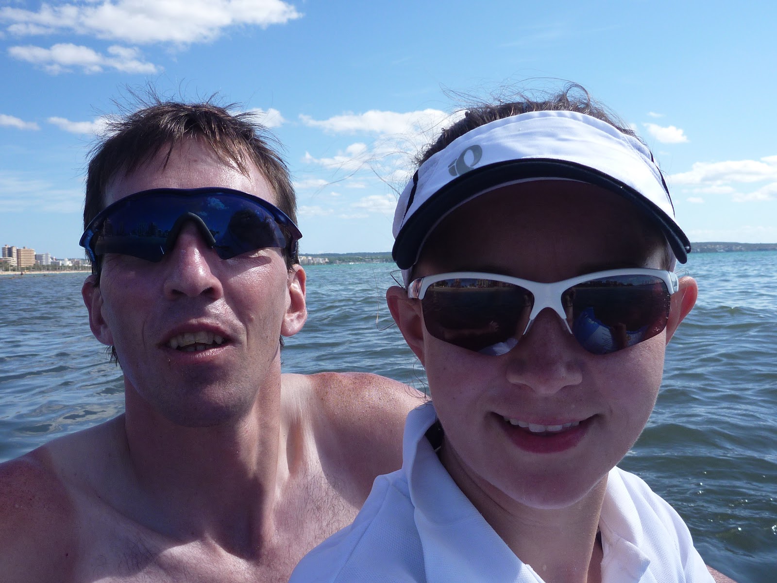 Schwimmen war dann solide, wobei ich aber wie so oft deutliche Koordinationsprobleme und damit kaum Wasserschatten hatte. Neo war verboten, Speedsuit bei 26 Grad aber erlaubt, 59:59min, Kam damit mit der 1. Frau, Michaela Renner-Schneck, aus dem Wasser. Diese Dame als 1. hatte den offensichtlich schlecht vorbereiteten Moderator auch überrascht, mich nicht.