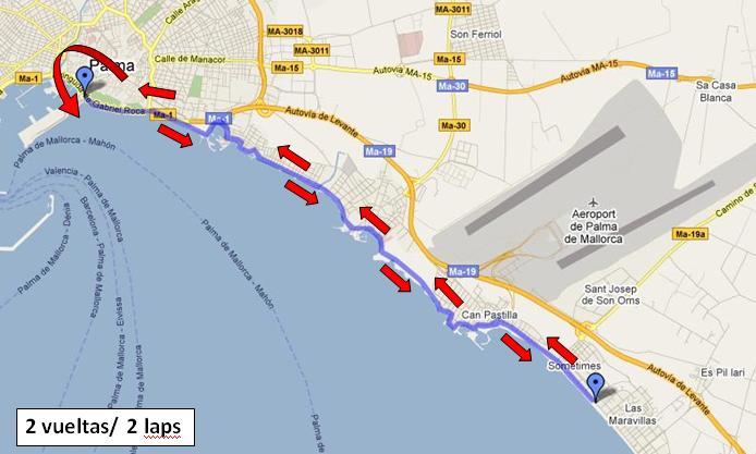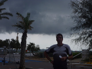 Nach einem mittelprächtigen Wechsel ging’s dann nach S’Aranjassa, dachte ich zumindest – hatte im Vorfeld allerdings die falsche Strecke abgefahren, daher war ich über die Anfahrt bis zur Hauptstraße nach Llucmajor nicht exakt informiert. Das sollte prompt bestraft werden. Nach knapp 2km fuhr ich auf einem Feldweg wieder auf die erste Dame auf, an einem leichten Anstieg mit einer Abzweigung nach links überholte ich sie. Die Pelonen, die in der engen Kurve standen, musste ich rechts liegen lassen, ging nicht anders. Sie waren mir auch Wurscht, schließlich war die Strecke vollgesperrt, ich lag an etwa 10. Stelle und wir waren in der 1. Runde, dass hieß kein Gegenverkehr. Eine Minute später war ich dann auch total überrascht, als das Motorrad, das schon die ganze Zeit nebenher knatterte an mich heranfuhr und mir der Typ auf dem Sozius mangels einer gelben Karte den gelben Post-It-Zettel zeigte. Ich überlegte erst eine Weile, um was es da ging, dann brabbelte ich noch 2 Takte in meinem gebrochen Spanisch – ach was, sinnlos! Gemäß den § sicher eine reguläre Entscheidung, die Frage nach der Verhältnismäßigkeit stellt sich trotzdem, wenn später Gruppen von Mitteldistanzlern über die Insel fahren und beim Lauf die aufgestellten Pelonen und Absperrleinen so ziemlich niemanden interessierten und man dabei Zig Meter abkürzen konnte. Meine Abkürzung hat mir nach Adam Riese max. 20cm gebracht. Sehr gut fand ich, dass man sofort eine Zeitstrafe bekommt, beim 1. Mal 5min, beim 2. Mal Disqualifikation. Ob aber irgendjemand außer mir noch eine Strafe, beispielsweise wg. „des Verdachts des Anbahnens des Windschattenfahrens“ bekommen hat, weiß ich nicht. Man kann’s aber nachsehen, die Zeiten sind im 2. Wechsel drin. Richtung Llucmajor kam dann mein persönlicher Favorit Alexander Agirretxe vorbei, da wollte ich so lang wie möglich dran bleiben, aber in Randa hatte ich schon über 30sec verloren. Hatte halt nada drauf. Dumm war dann auch noch, dass meine Wattmessung nicht funktionierte. Ein ganz Penibler hatte Dianas und mein Rad während unserem Schwimmen umgestellt, damit alle Räder einheitlich mit dem Vorderrad zum Laufweg standen. Die Polareinheit war durch die Aktion aber offensichtlich verschoben worden. Mit Kreuzotter lassen sich aber noch Näherungswerte ermitteln, in der 2. Runde bin ich dann ohnehin unterirdisch gefahren, auch kaum noch auf dem Bügel. Die Ironie wollte es mal wieder so, dass ich ausgerechnet in so einem Rennen noch nicht mal isoliert, sondern in einer kleinen Gruppe war. So richtig geholfen hat das aber irgendwie nicht, von hinten kam weit und breit niemand, aber die anderen hatten auch nix mehr drauf und wollten oder konnten bergab auch keinen Druck machen.